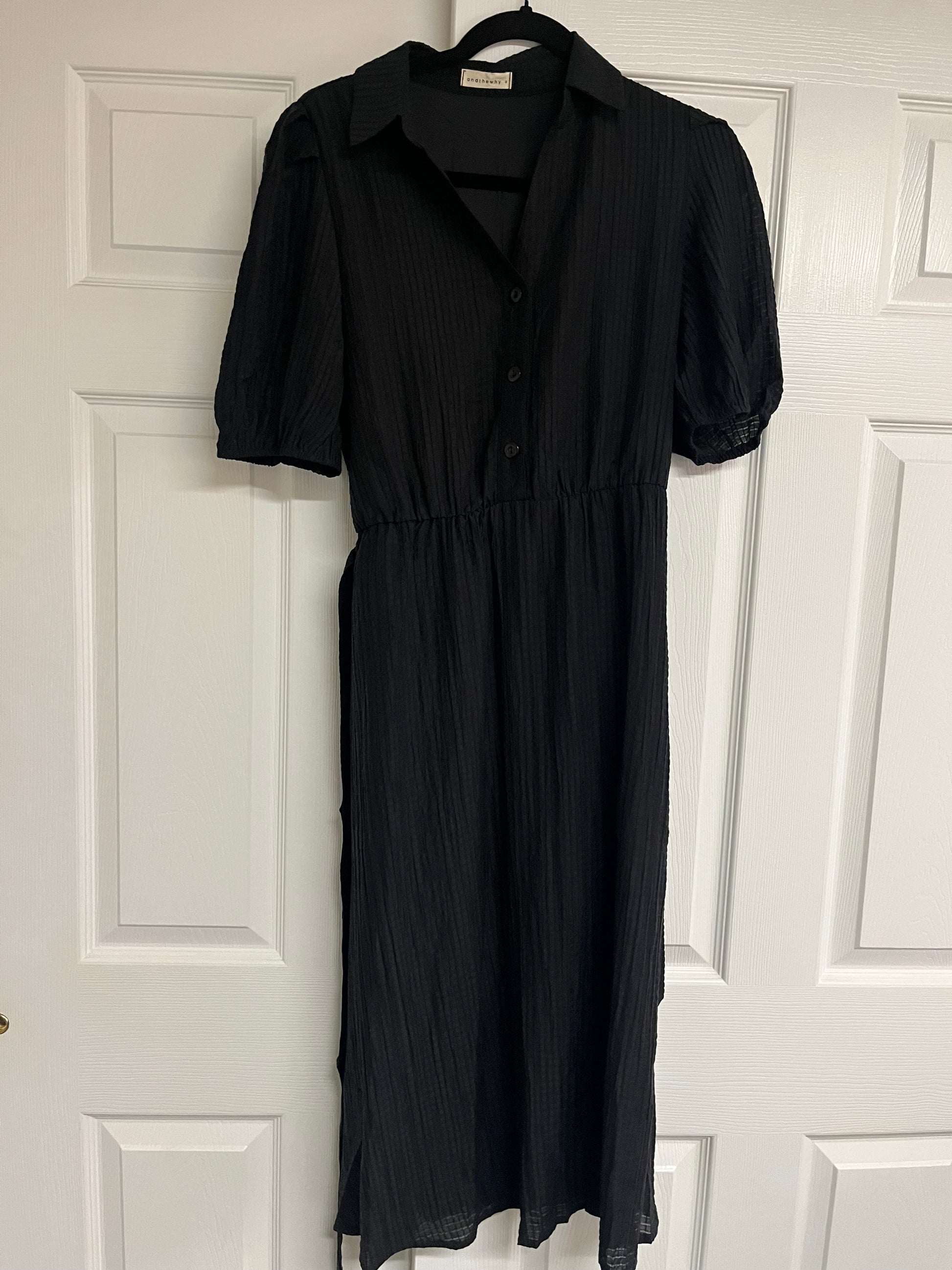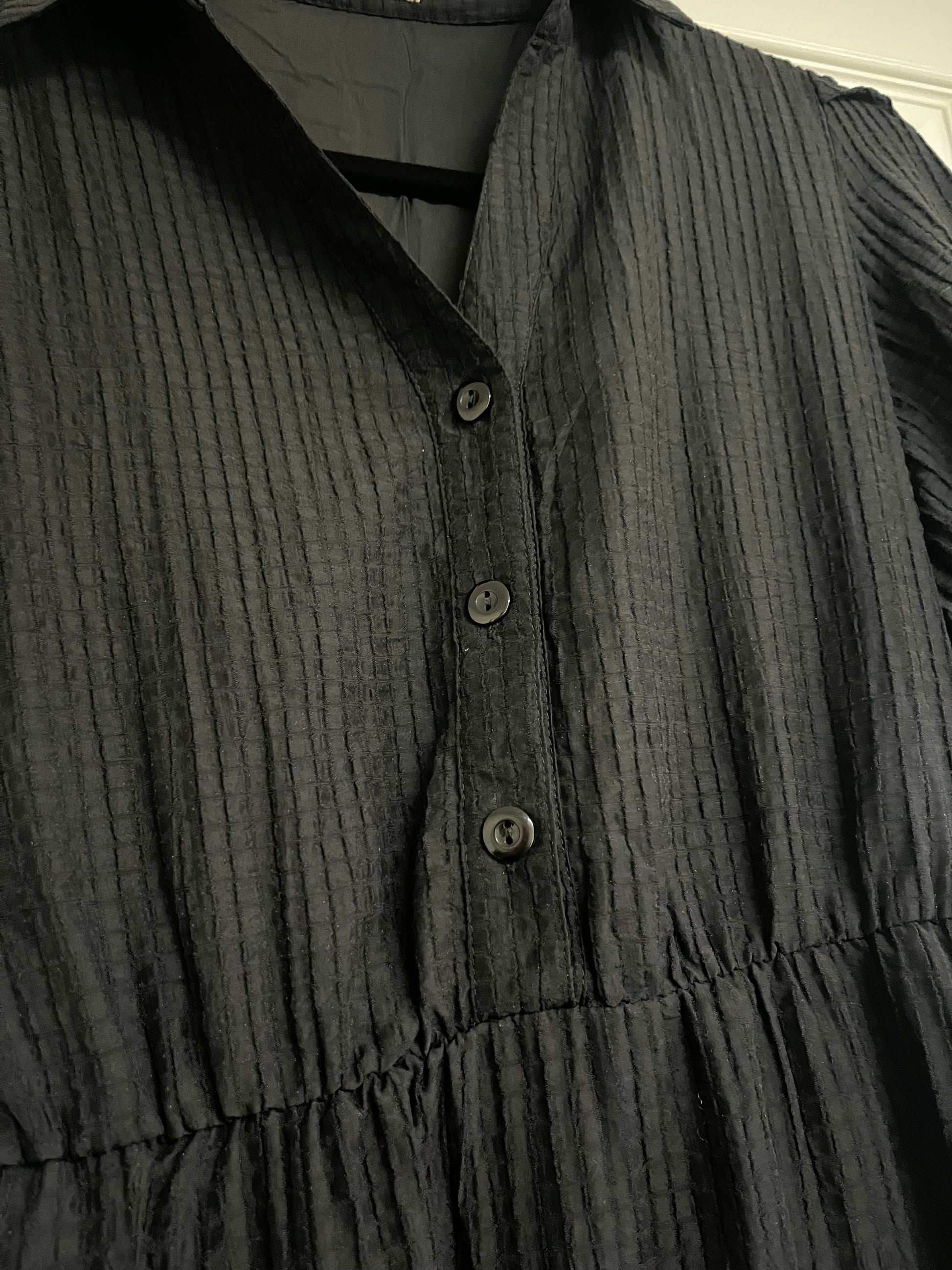 The Cassidy Dress features a distinctive waffle texture that adds subtle dimension and sophistication. Designed with functional buttons and a removable belt, it offers customizable styling options for versatile wear. Practicality meets elegance with thoughtfully integrated pockets, making this black dress both stylish and convenient for everyday use. Perfect for those who appreciate refined details and adaptable fashion.