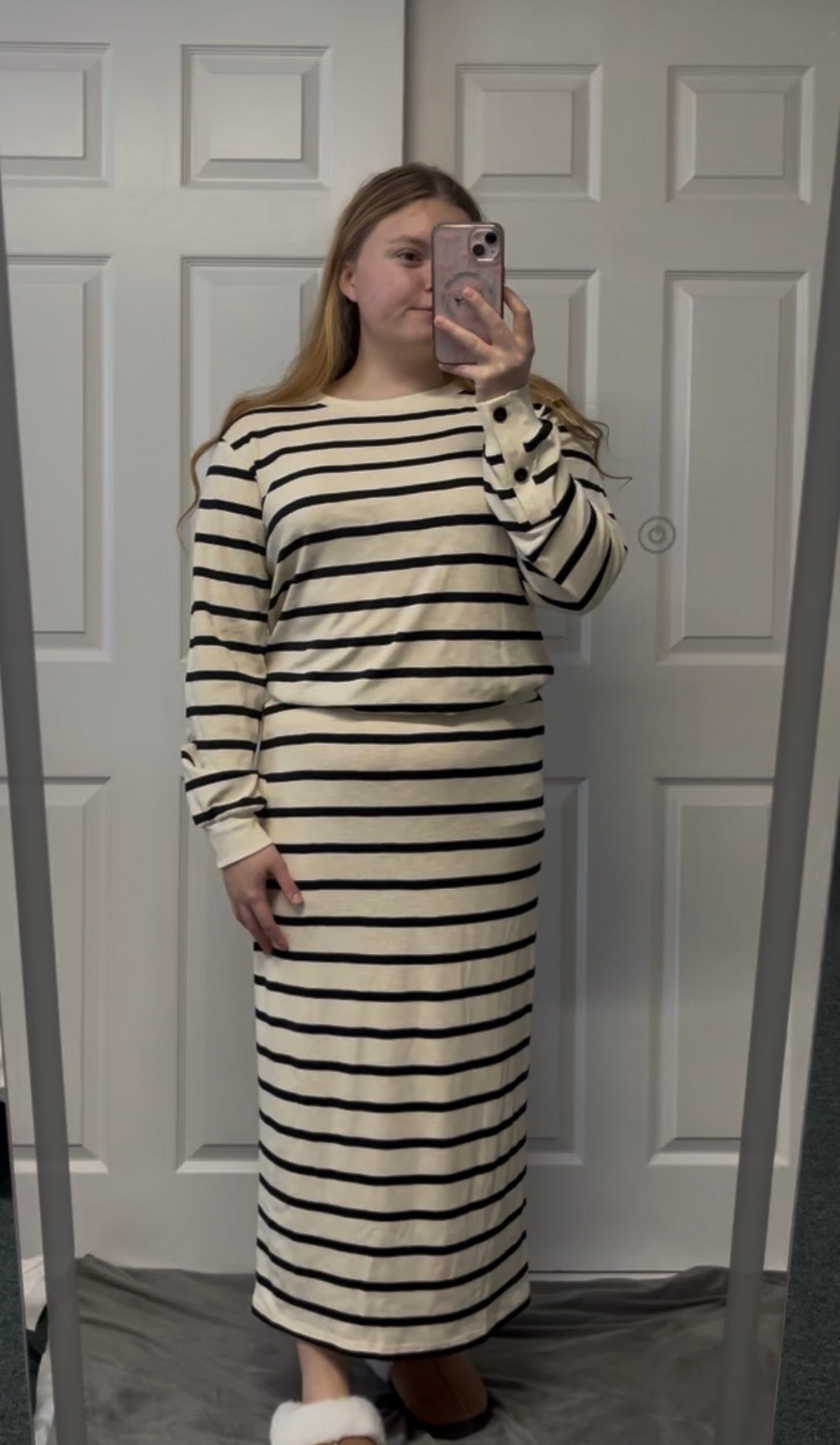Effortlessly elevate your style with our Emery Set. This timeless black and white duo features elegant button details on the sleeves and a chic maxi skirt to create a flattering silhouette. Stay warm and fashionable in this must-have sweater set.