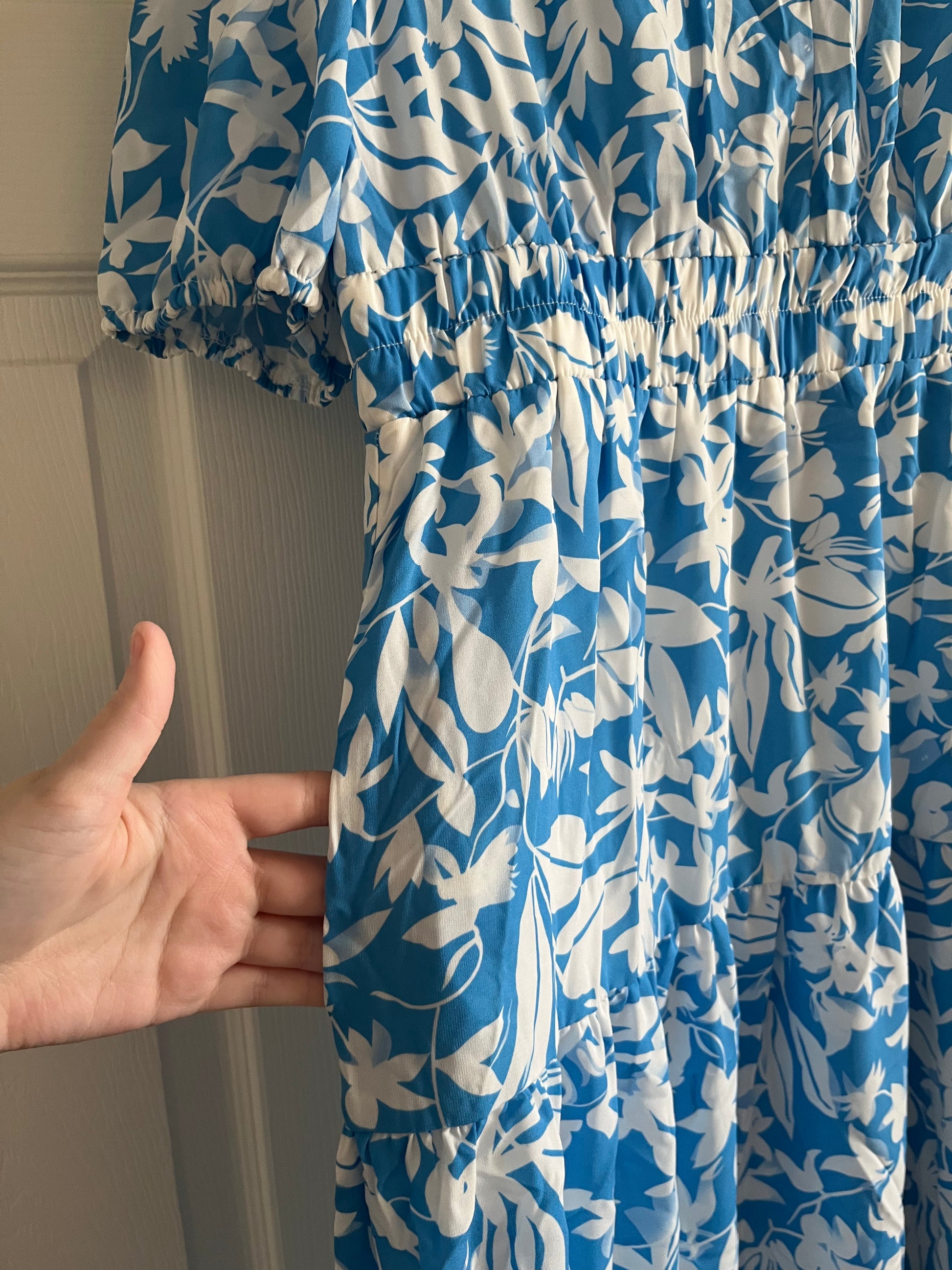 The Kenna Dress features a delicate baby blue floral design, complemented by an elastic waist that ensures comfort and flexibility. Practical pockets enhance functionality, allowing for convenient storage. This dress combines aesthetic appeal with usability, making it suitable for diverse occasions.