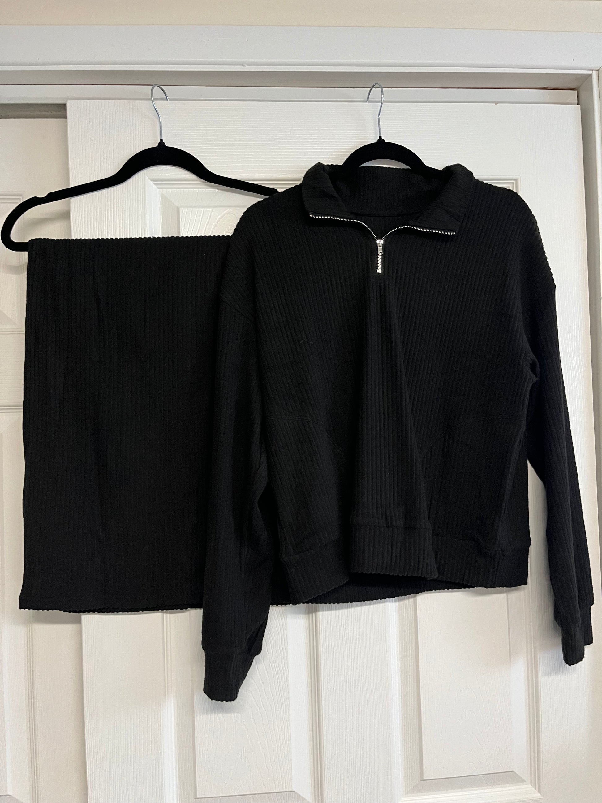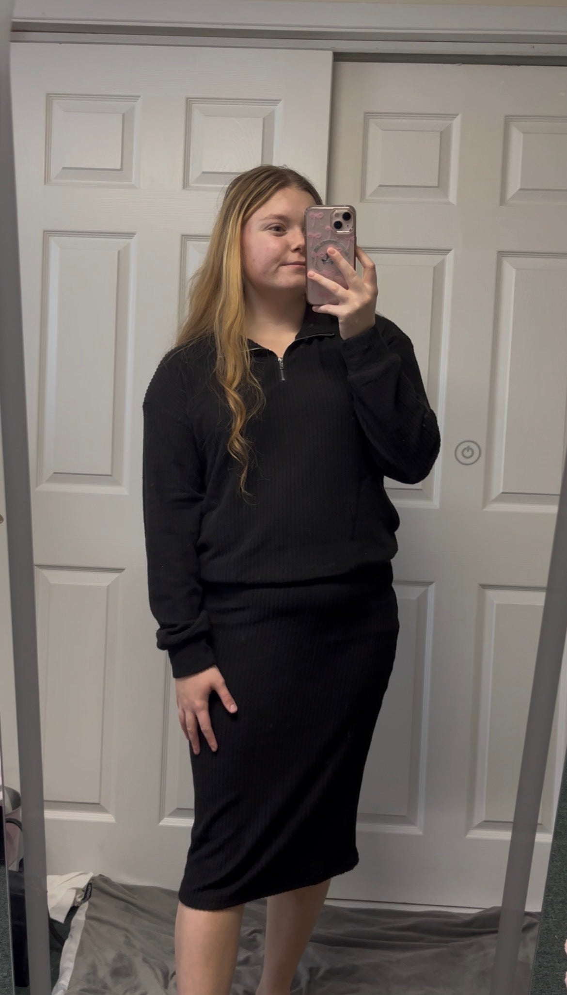 The Blair Set features a quarter-zip sweater made with a super soft, ribbed material and a black skirt. This stylish and comfortable set is perfect for any occasion. Elevate your wardrobe with this must-have combination.