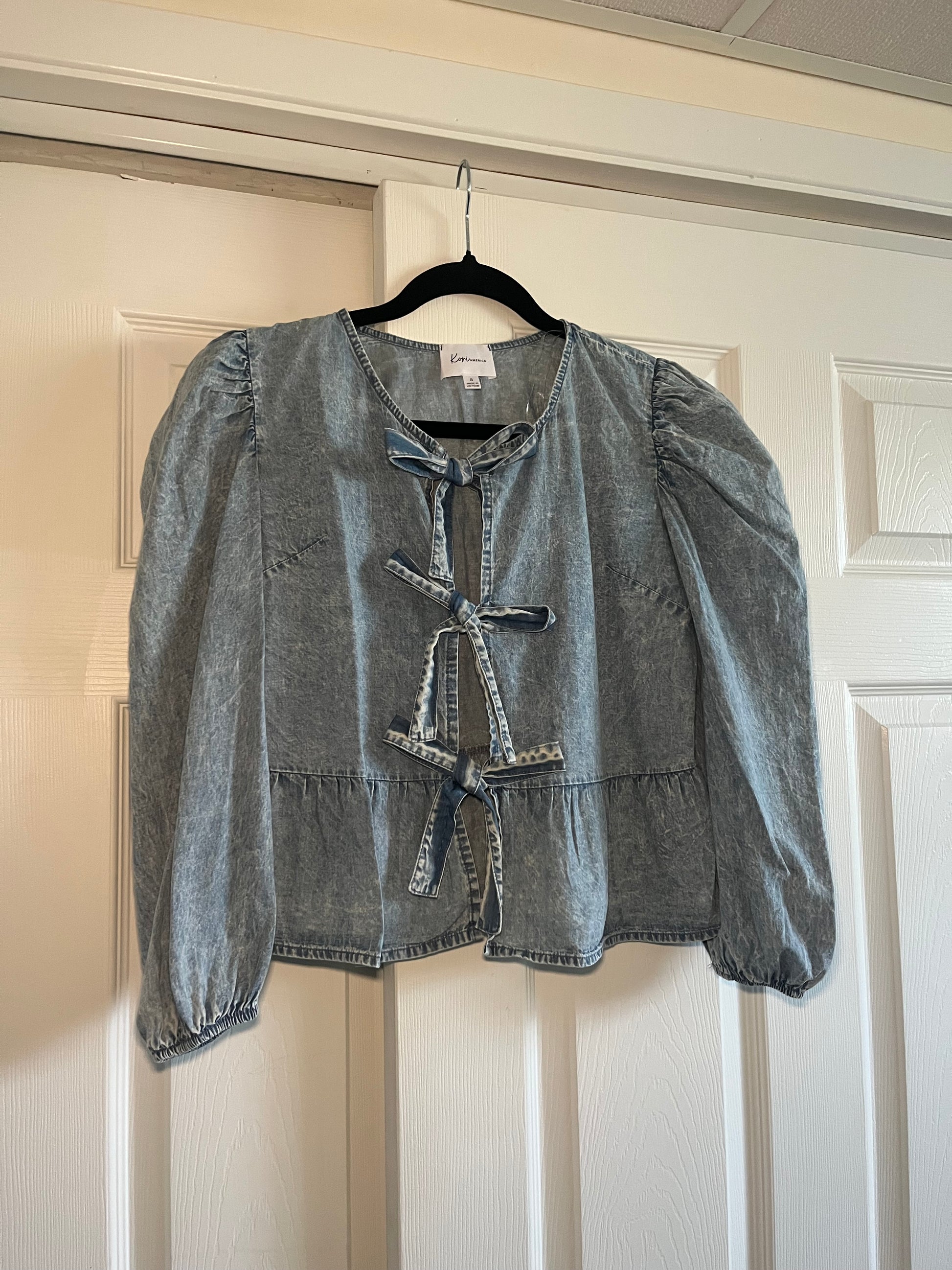 The Wren is a versatile addition to your wardrobe with its delicate bows and stylish light blue denim. The elastic sleeves add a touch of flexibility and comfort to the chic design, making it a must-have for any fashion-forward individual. Its classic yet modern look is perfect for any occasion.